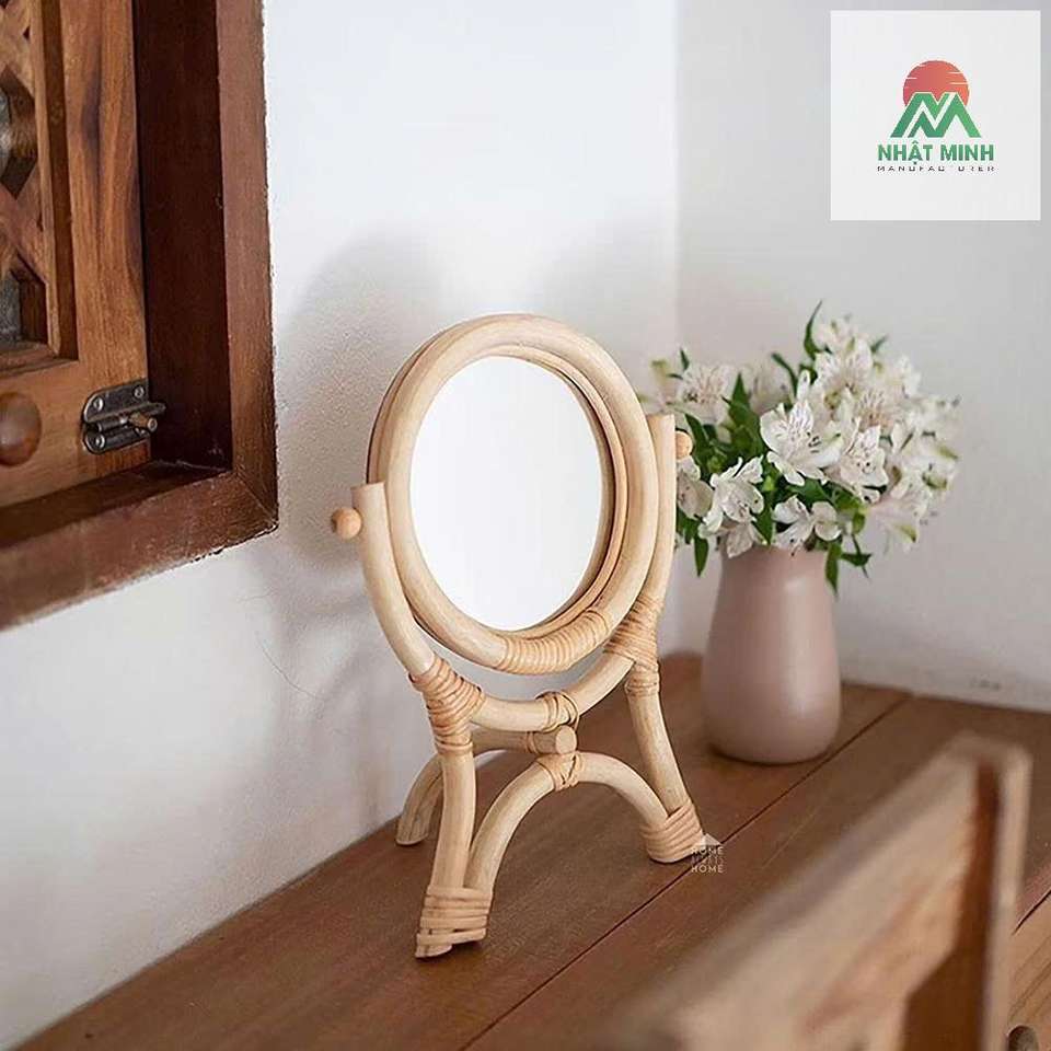 Espejo de Maquillaje de Ratán para Mesa con Soporte Trípode Estable y Reflejo Claro Giratorio Suave