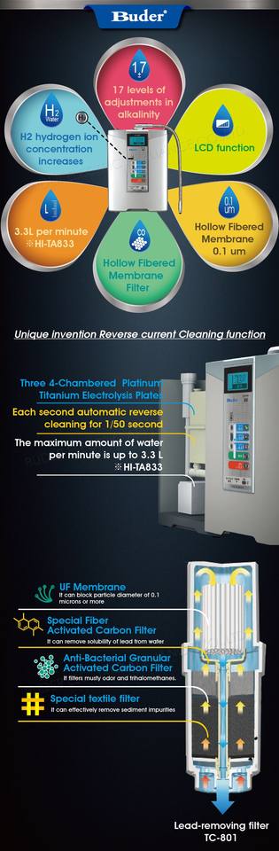 Ionizador de agua alcalina Buder de Taiwán, unidad instalada de grifo de escritorio de plástico de potencia Manual para uso doméstico, fabricado en Japón