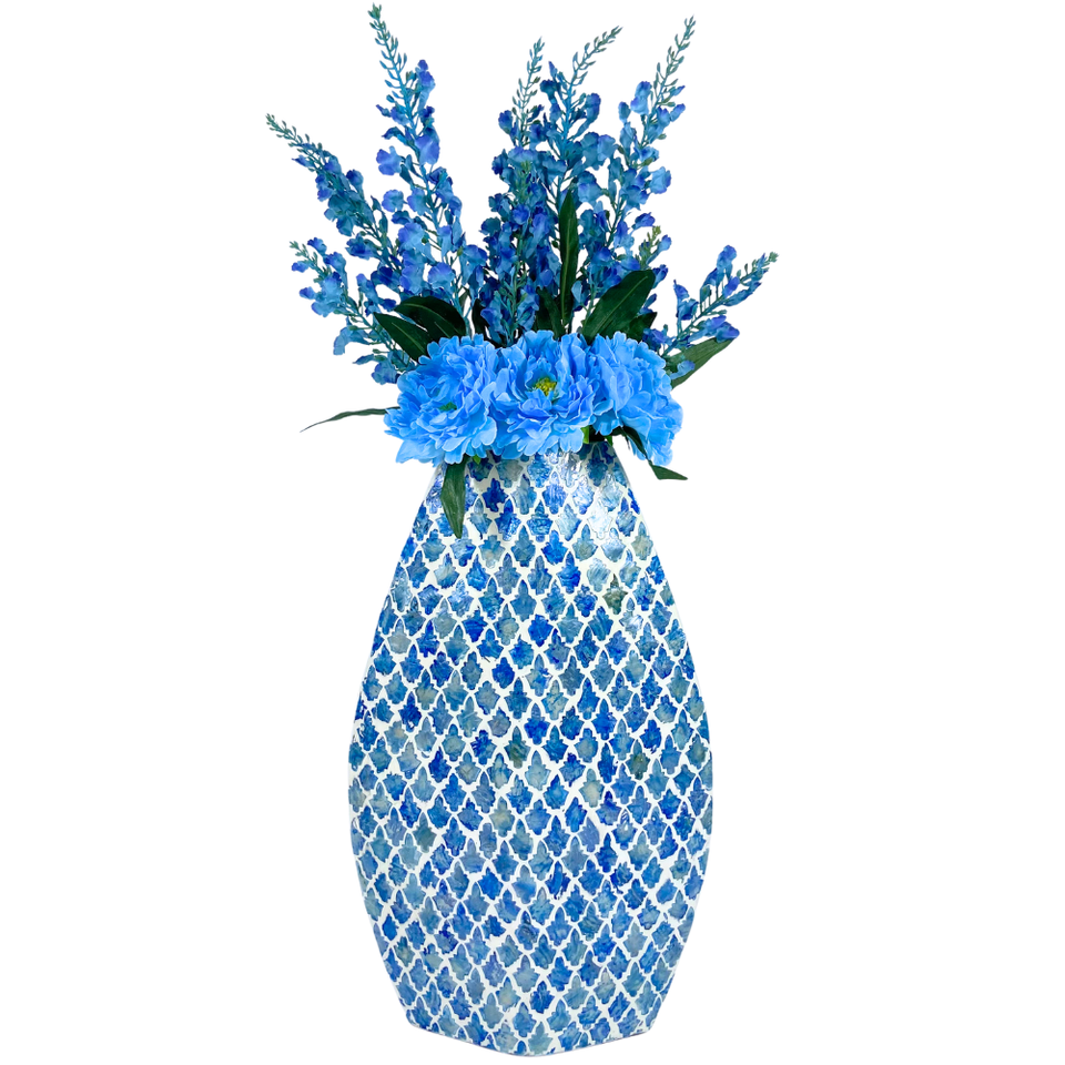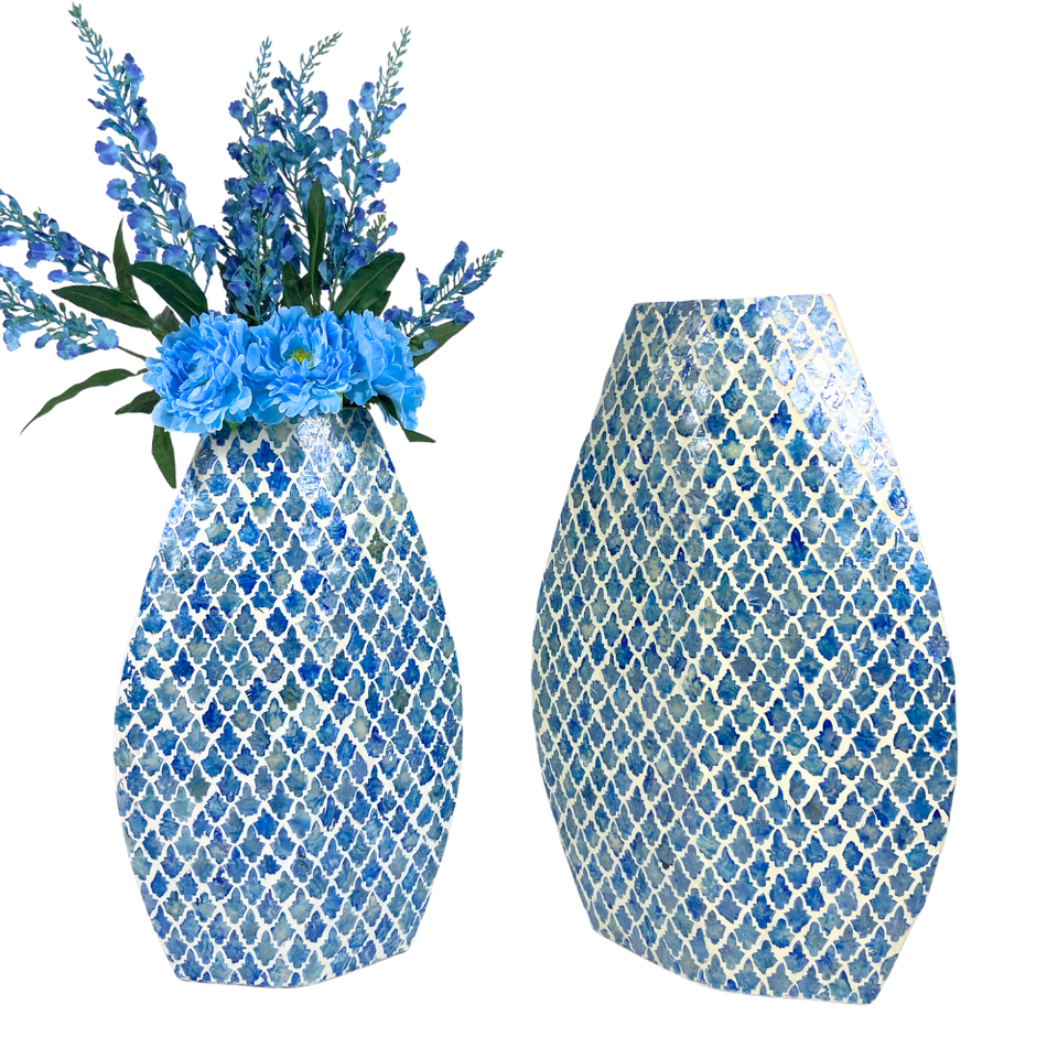 Jarrón de cartón decorativo con incrustaciones de Capiz marroquí azul alto hecho a mano con patrón geométrico para centro de mesa de boda o decoración del hogar