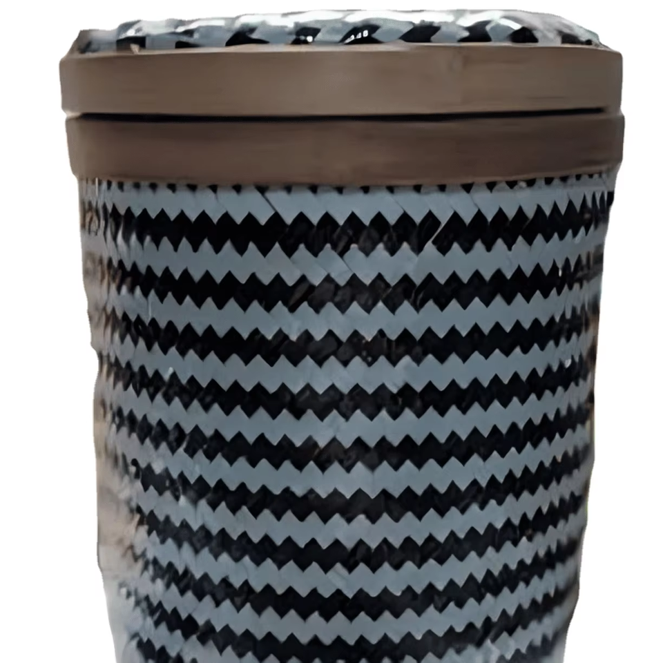 Cesto de ropa sucia de bambú tejido a mano alto con cesto de almacenamiento ecológico tejido en zigzag blanco y negro con tapa para hogares modernos