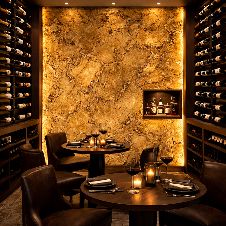 Lámina de Cuarcita Translúcida Marrón Bronceado, Acabado con Brillo Natural Cálido, Retroiluminada, para Decoración de Interiores, Paredes, Techos, Arquitectura