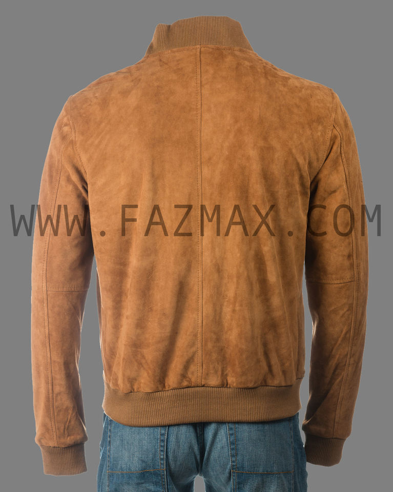 Tan Suede Bomber Rib-Knit Collar Chaqueta de cuero 2024