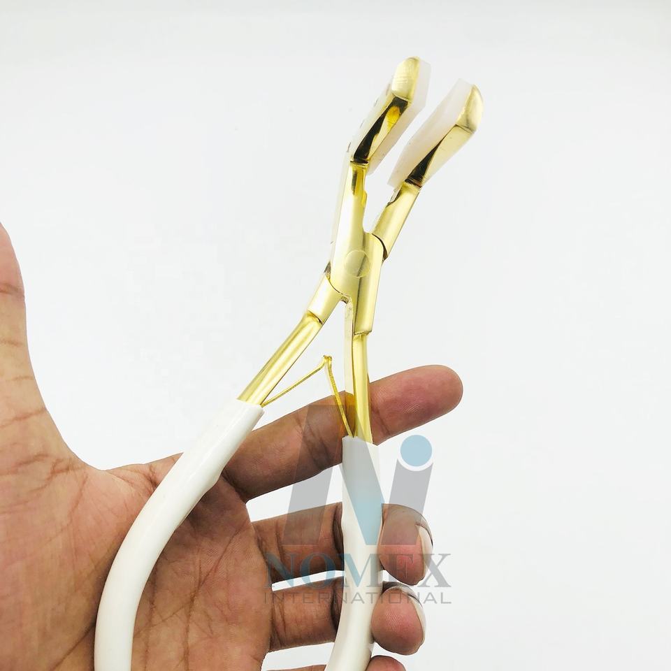 Cinta de acero inoxidable de grado Quirúrgico Internacional Nomex, alicates para extensiones de cabello, manijas de agarre blancas chapadas en oro, profesional