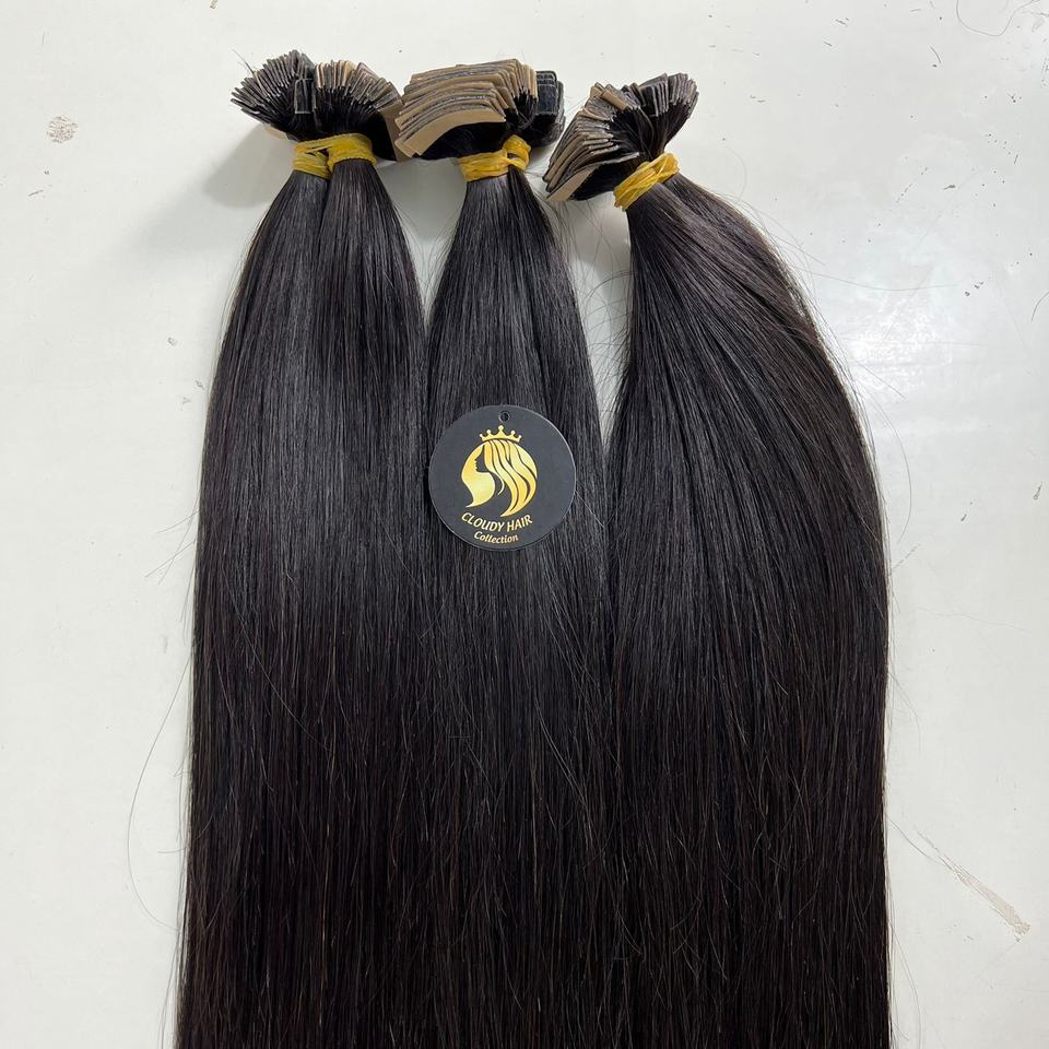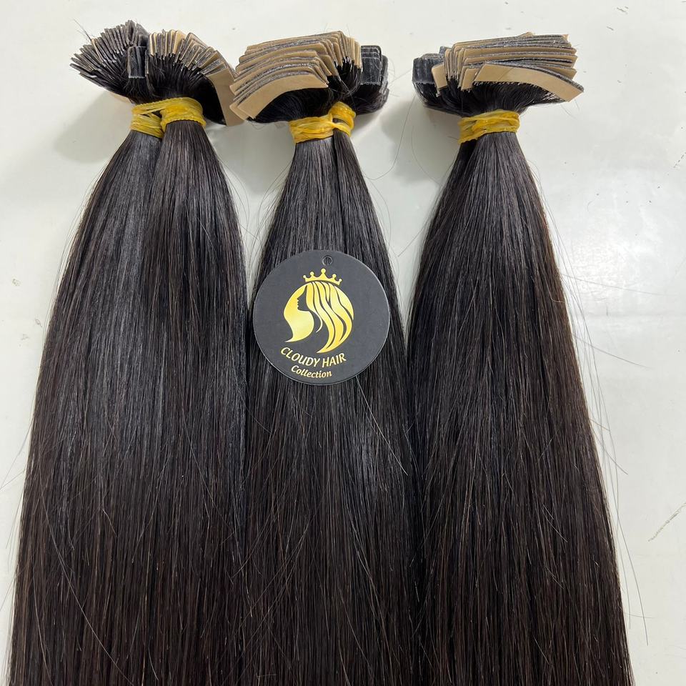 Extensiones de Cabello Adhesivas, Cabello Liso, Color Natural, Cabello Humano Virgen Brasileño, Doble Trama, Cutícula Alineada, Base de Seda Remy