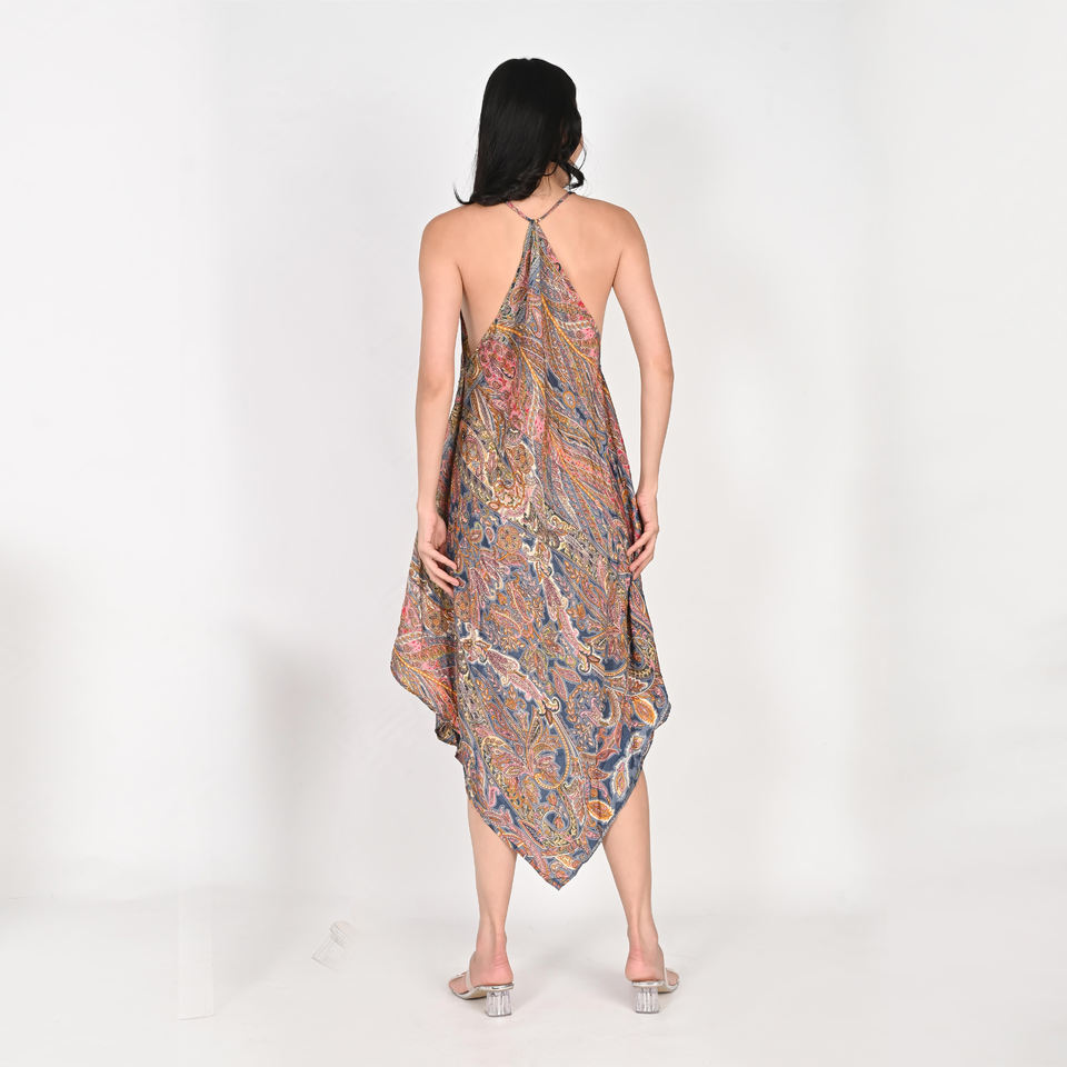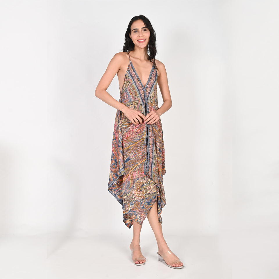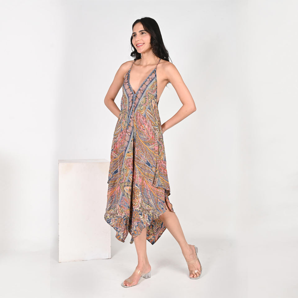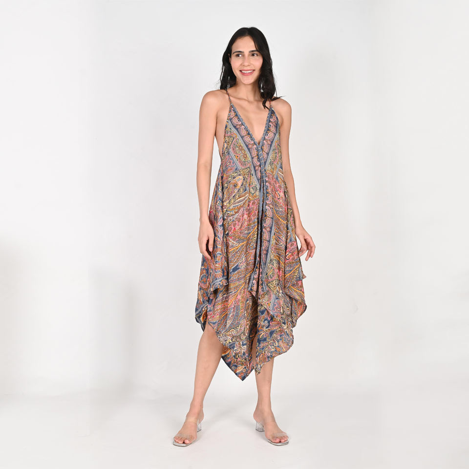 Longitud del té Ajuste relajado Escote en V profundo Vestido de seda Sari Hermosos vestidos de verano sin mangas