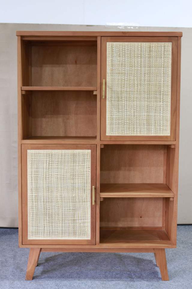 Estantería de Almacenamiento para Sala de Estar de Teca y Ratán, Diseño Moderno de 2 Puertas y 8 Estantes, Independiente