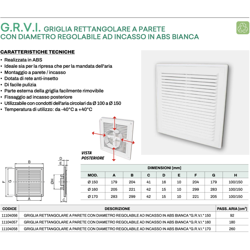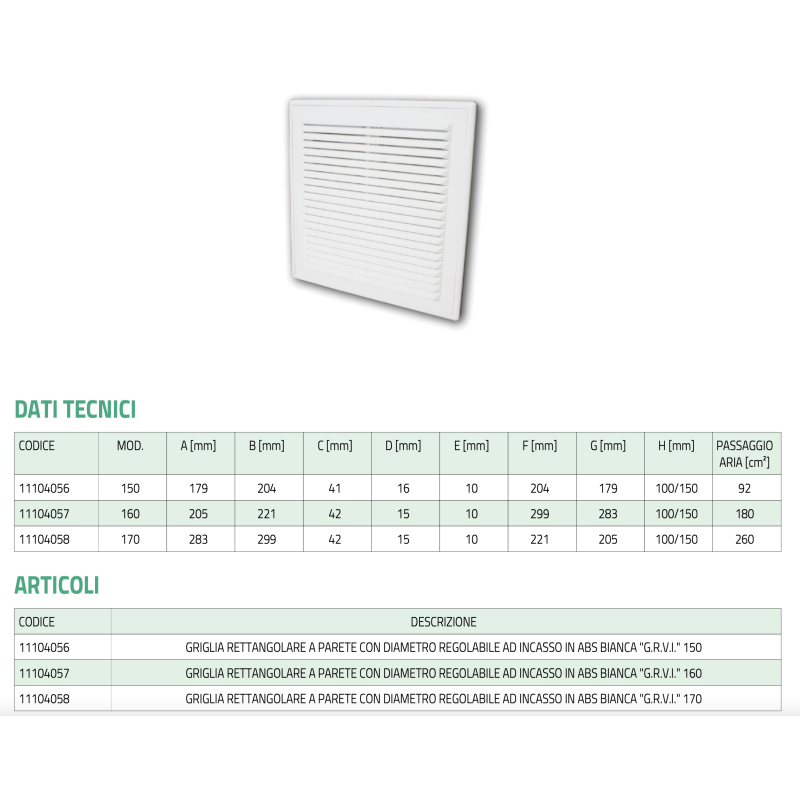Tecnosystemi G.R.V.I. Rejilla de Pared Rectangular Blanca de ABS, Rejillas y Grelas Integradas con Diámetro Ajustable