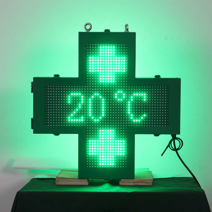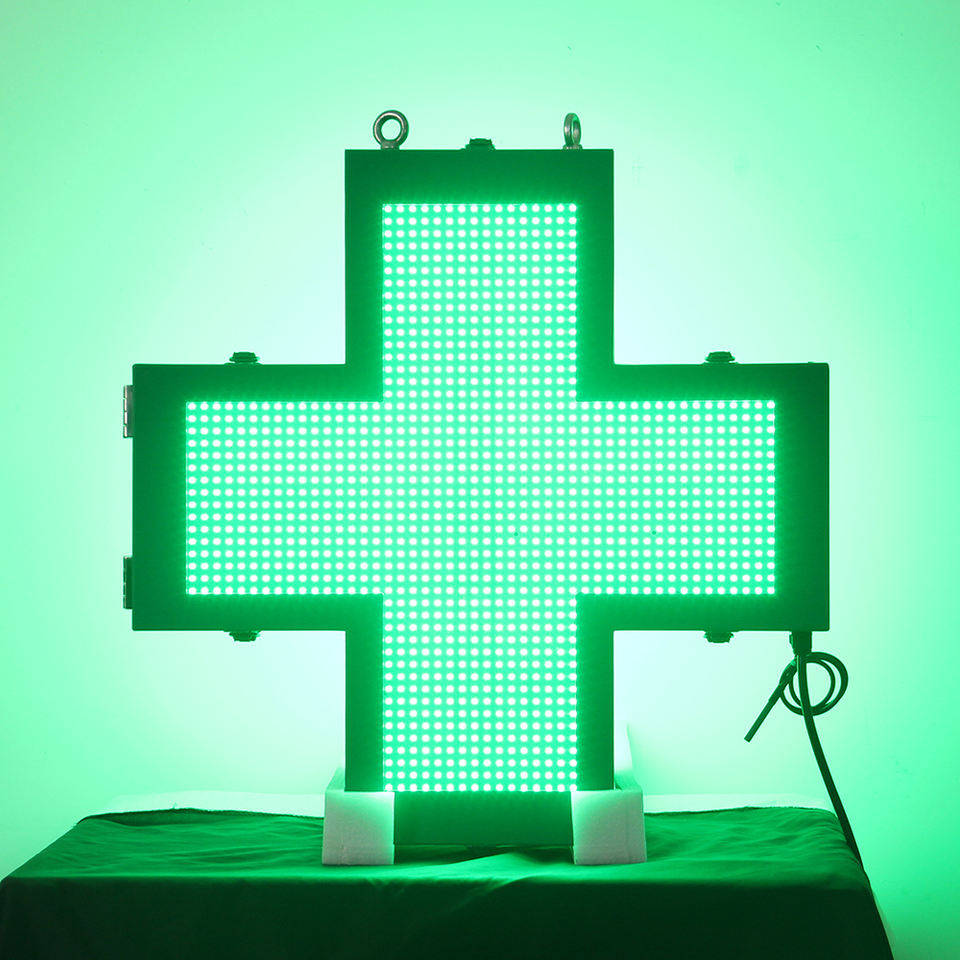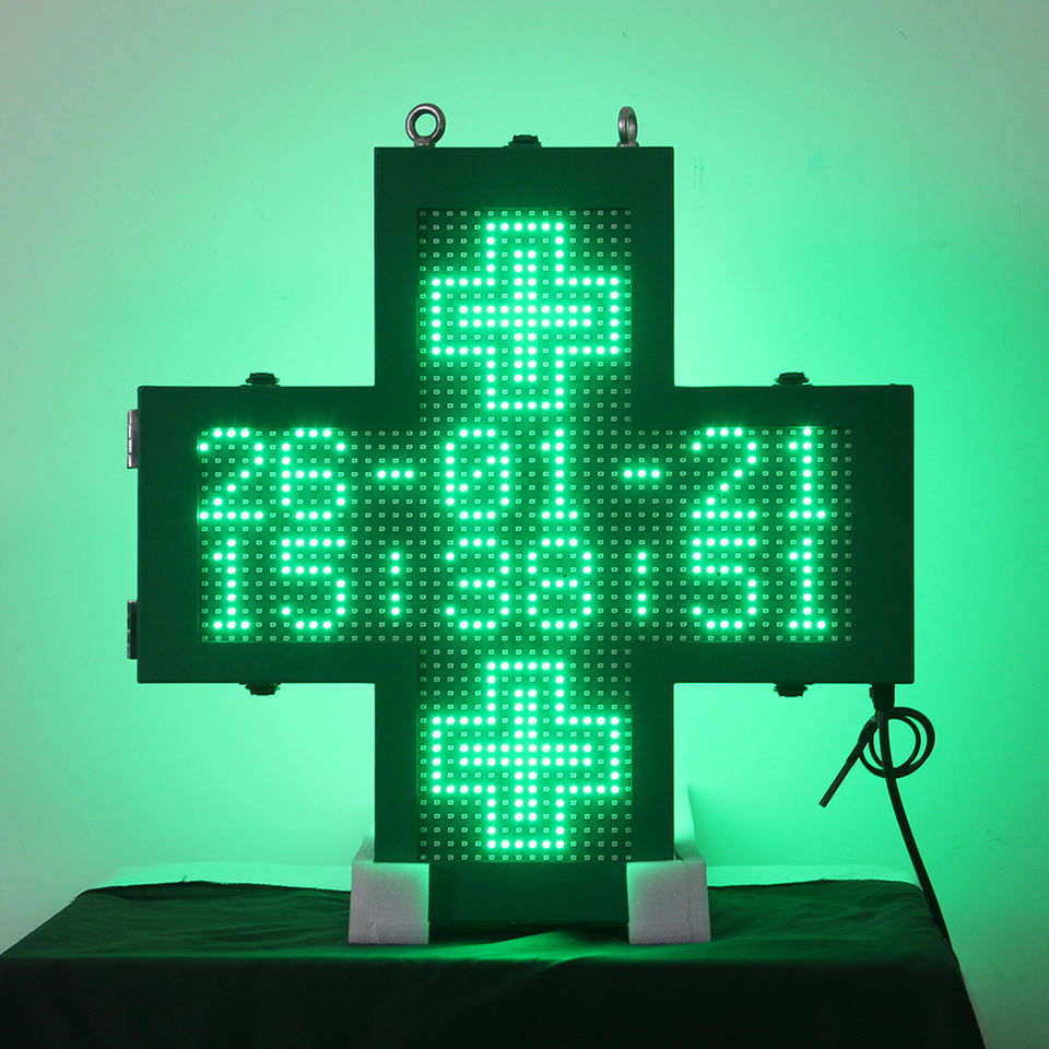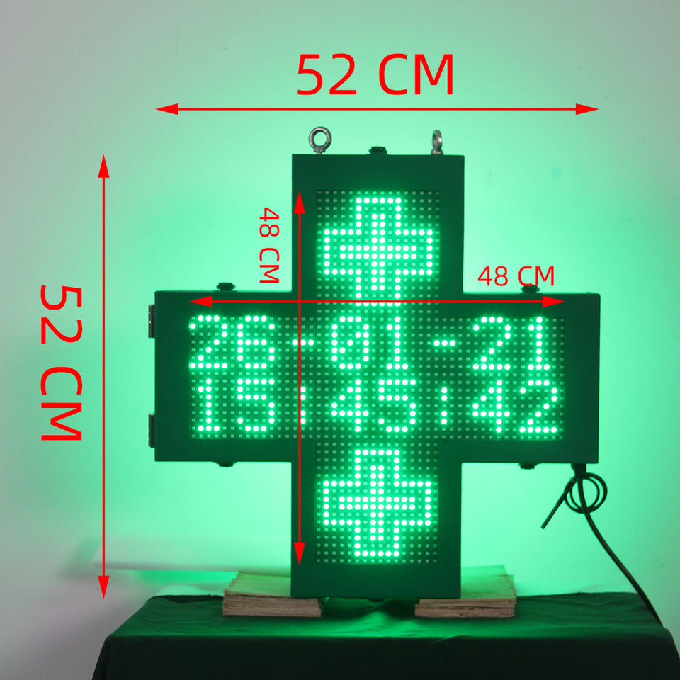 Letrero LED Programable por Temperatura y Tiempo para Farmacias, Impermeable, 48CM, Color Verde, Cruz de Farmacia para Exteriores
