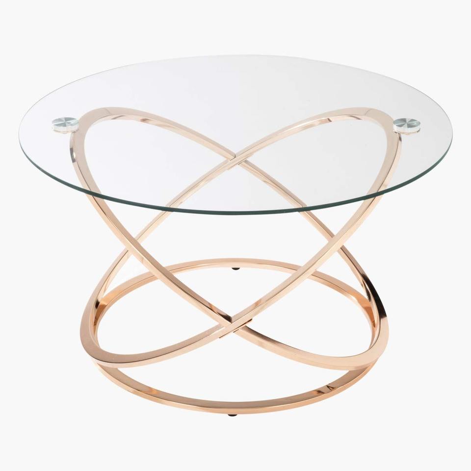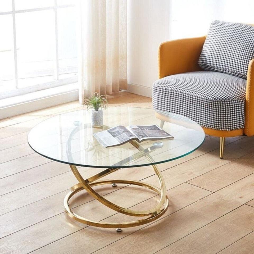 Mesa de Centro Redonda con Tapa de Vidrio Templado y Base de Metal - Dorado/Vidrio Transparente