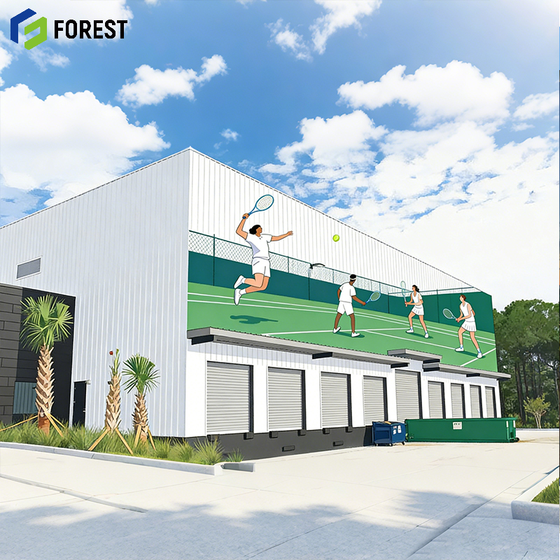Pabellón de Tenis Temporal de Estructura Modular de Acero, 100m de Envergadura, Centro de Entrenamiento Profesional, Bajo Costo, Diseño Moderno, Eficiencia Energética