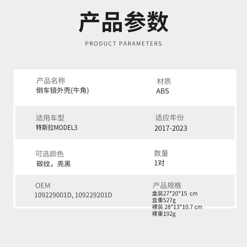 Carcasa de Espejo Retrovisor para Tesla Model 3, Forma de Cuerno, Cubierta de ABS, Fibra de Carbono, Negro Brillante, 2017-2023, OEM 109229001D 109229201D