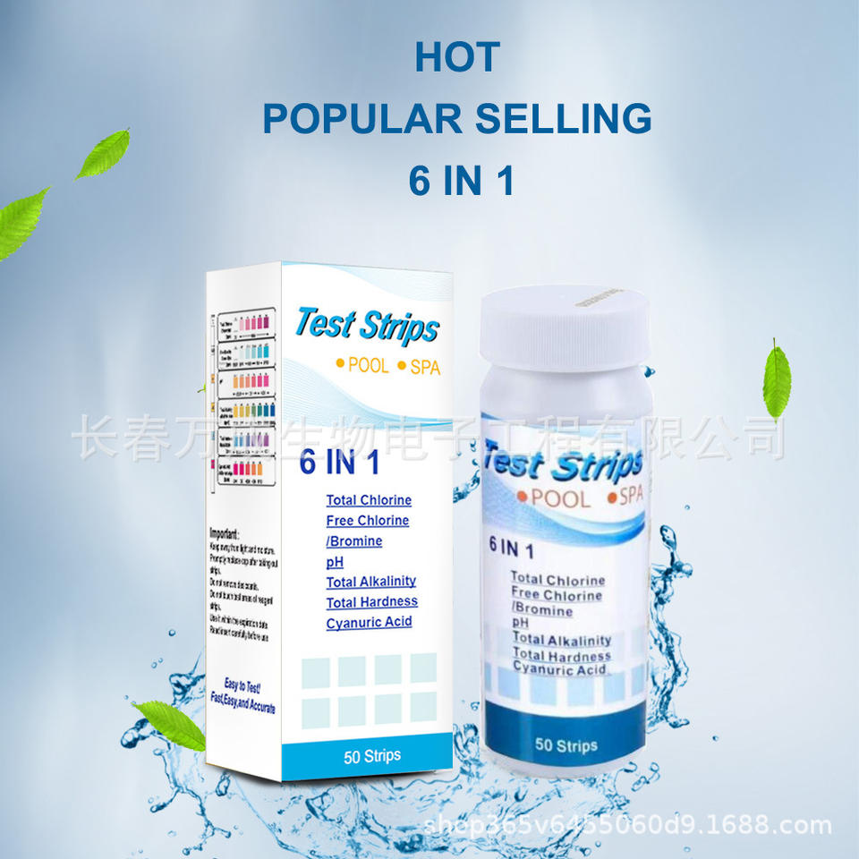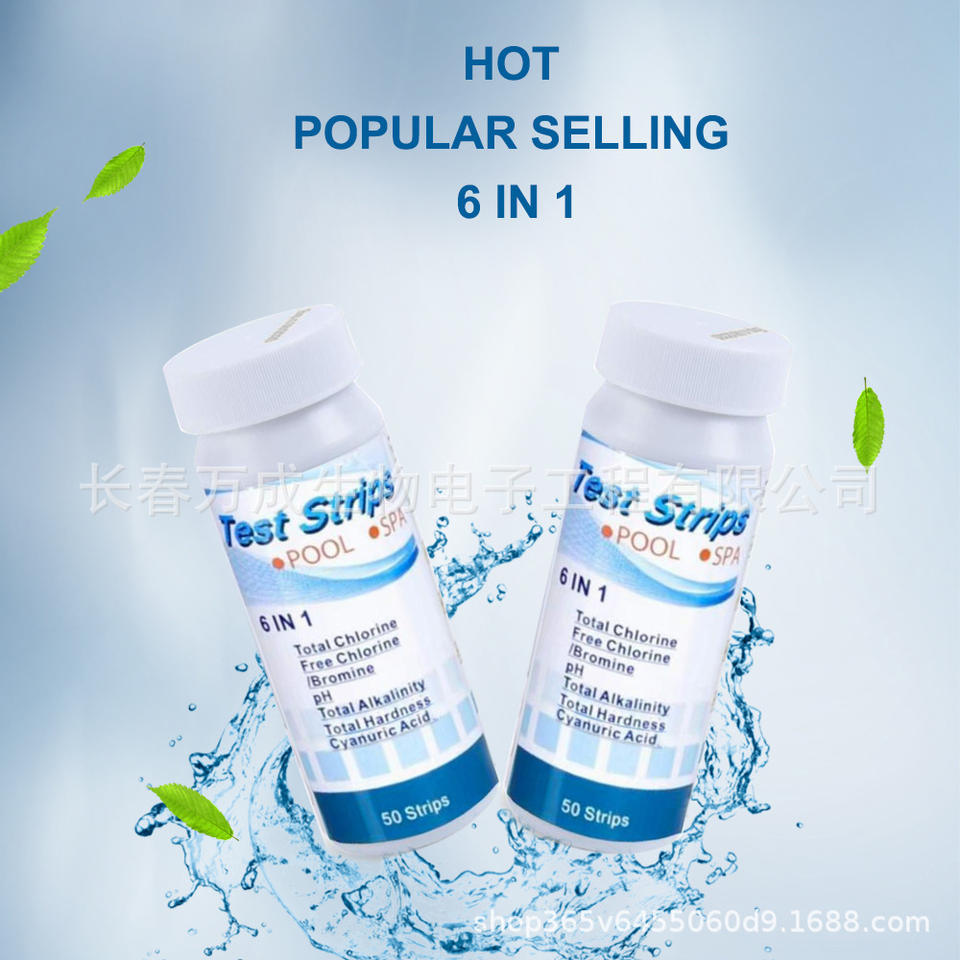 Tiras reactivas 6 en 1 para la calidad del agua de piscinas y spas: Cloro total, cloro libre, pH, alcalinidad, dureza, ácido cianúrico, 50 tiras