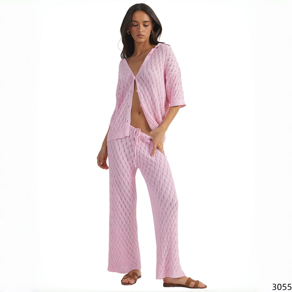 Conjunto de suéter de punto calado texturizado para mujer, camisa de manga corta con cuello tipo campamento y pantalones de pierna ancha con cintura con cordón, ropa de resort