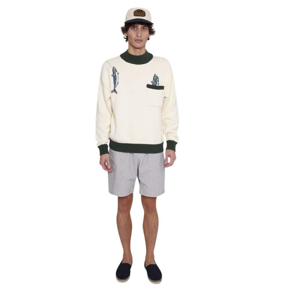 Suéter Angler con Tejido de Lana Gruesa, Botones y Detalles de Peces Bordados en 3D, Hombros Caídos, Corte Holgado, Ropa de Invierno