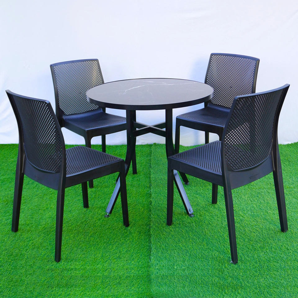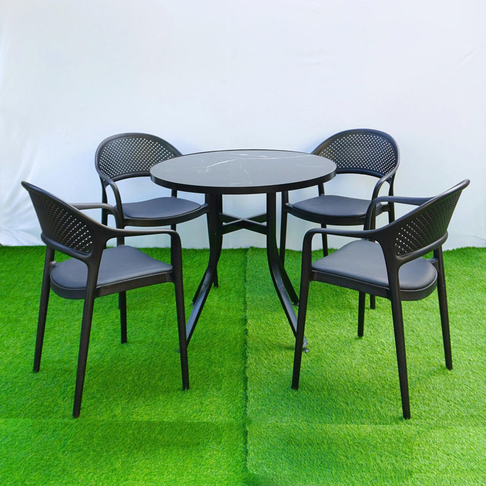Mesa Redonda de Plástico de Color Negro con Tablero de Imitación de Azulejos - La Mesa de Exterior Moderna, Impermeable y Elegante.