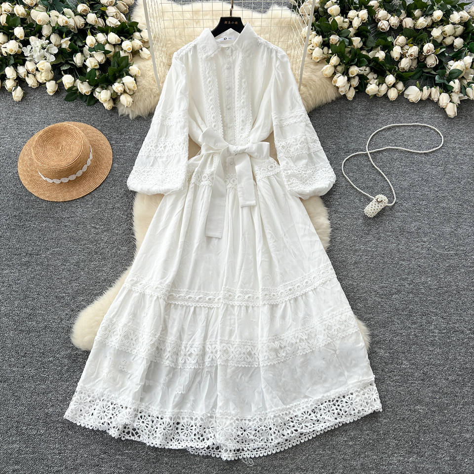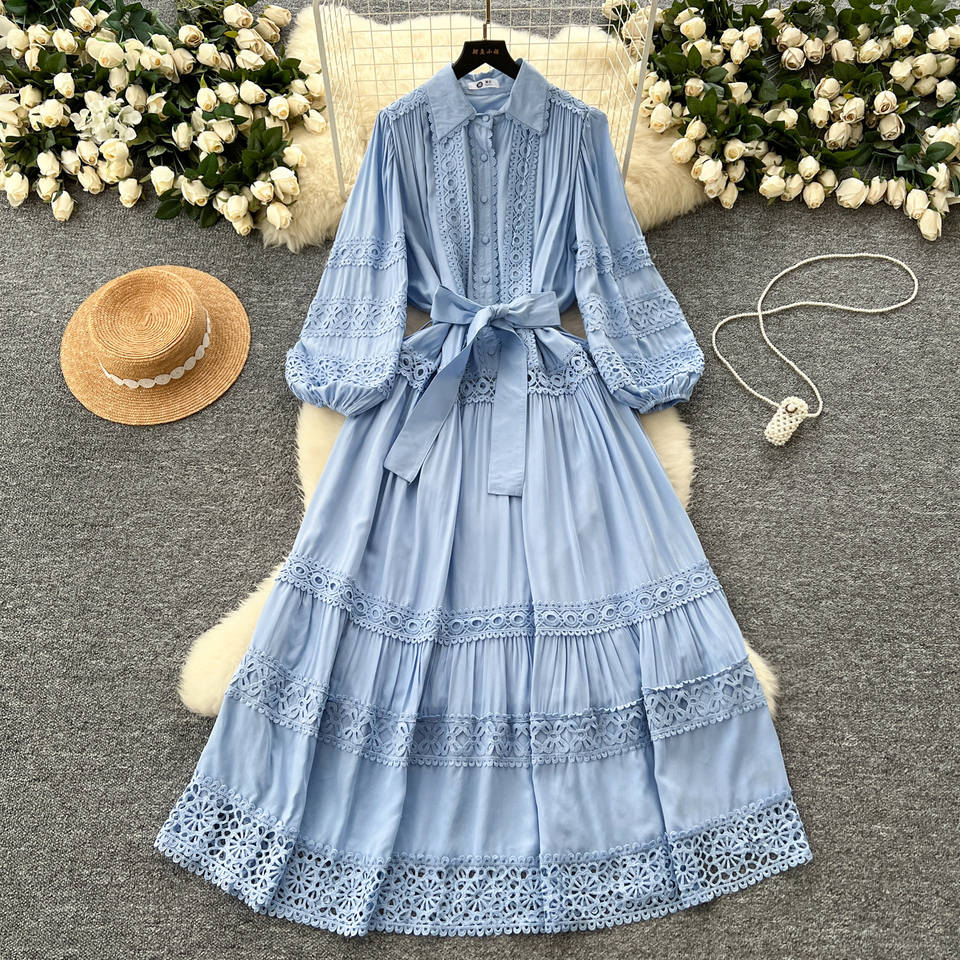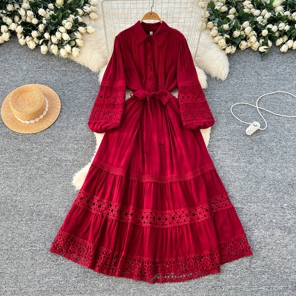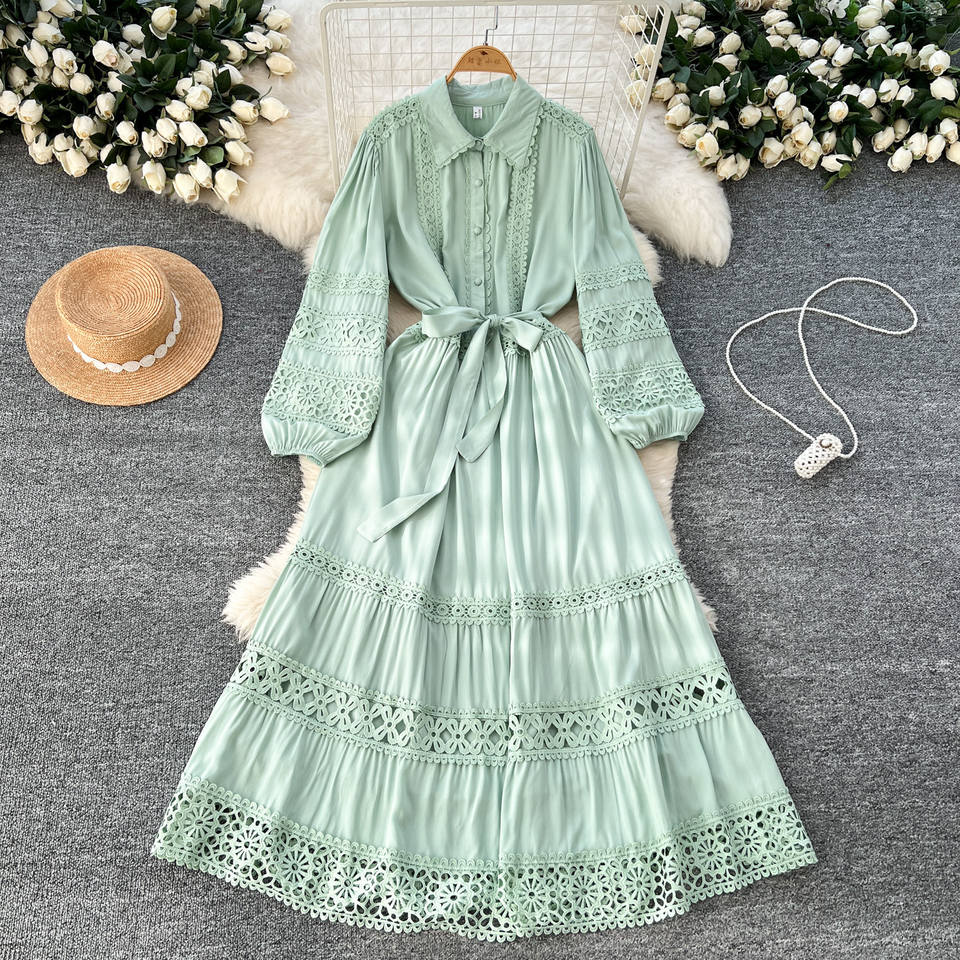 El Nuevo Vestido de Encaje Calado con Parches de Moda Primaveral para Mujer es un Vestido Largo Elegante y con Estilo