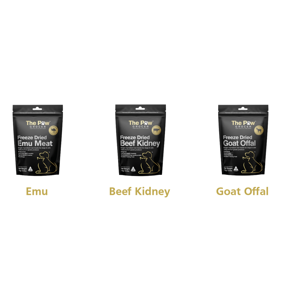 Golosinas para Perros y Gatos de Proteína Única Liofilizadas The Paw Grocer (Etiqueta Negra) 72g Emú
