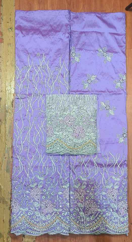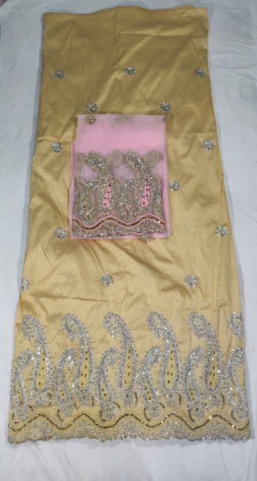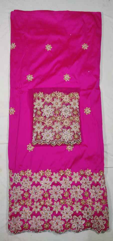 La tradicional y atemporal tela de tafetán George Wrapper nigeriana con adornos de piedras y un intrincado patrón de recortes sobre un diseño floral.