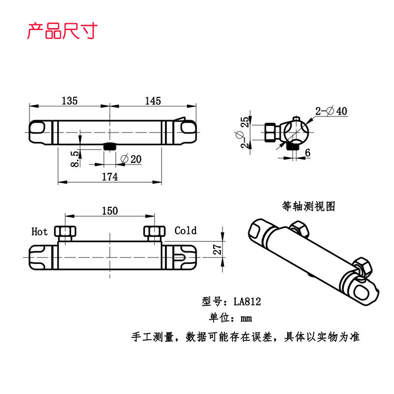 Cuerpo de ducha termostático orientado hacia arriba para accesorios de instalación.