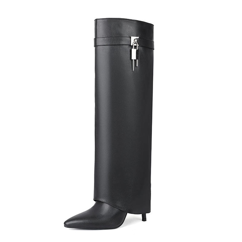 Botines de tacón de aguja fino con punta, estilo superpuesto, para vestir, con cierre metálico, plegables, hasta la rodilla, para mujer