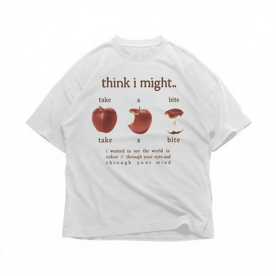 Camiseta con gráfico de manzana 'Think I Might Take A Bite', estilo vintage, oversize, unisex, para uso casual, top para amantes de la gastronomía
