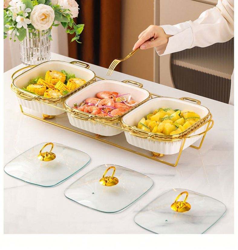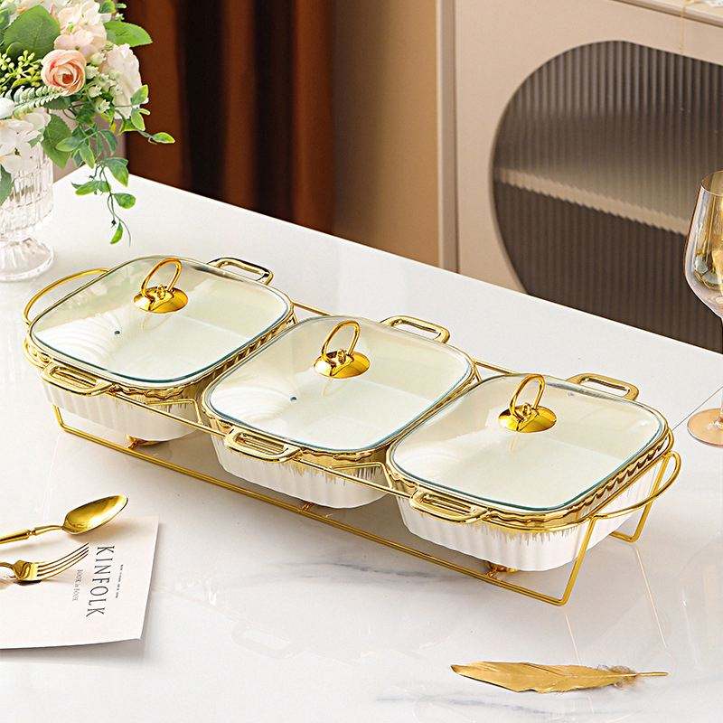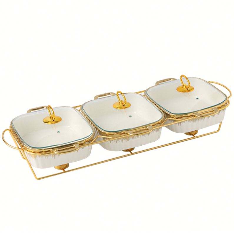 Tres ollas de cerámica para sopa, resistentes a altas temperaturas, dos orejas, rayas cuadradas con borde dorado, bandeja para hornear de gran capacidad