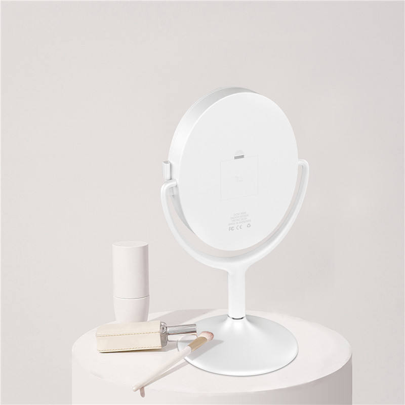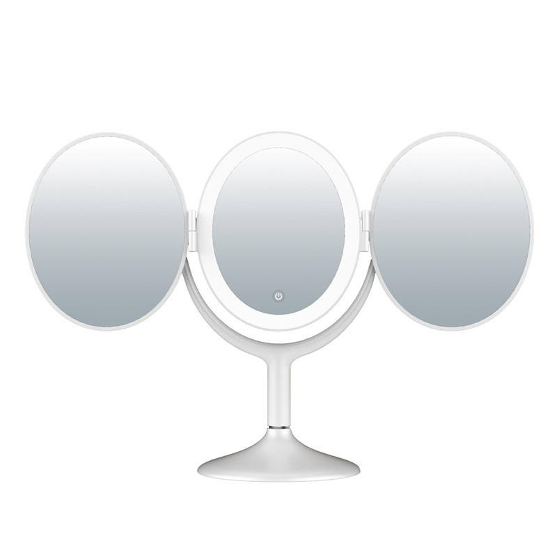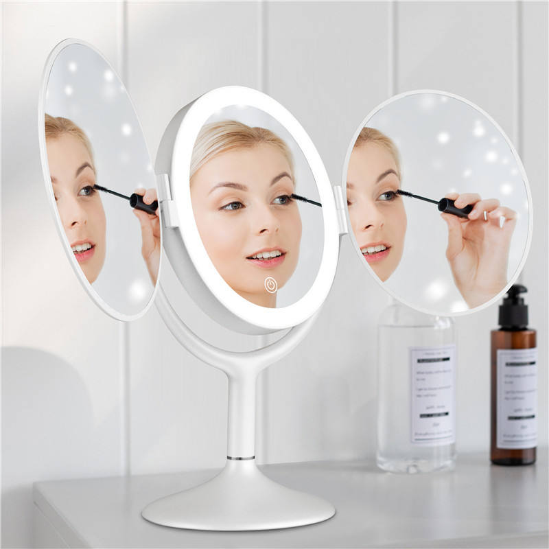 Espejo de maquillaje triple plegable con luz LED, espejo de belleza redondo blanco para uso en el tocador.