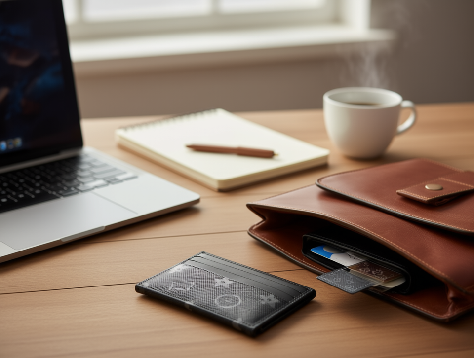 Tarjetero de tres capas 3 en 1 de microfibra y cuero sintético estilo minimalista para tarjetas con serigrafía