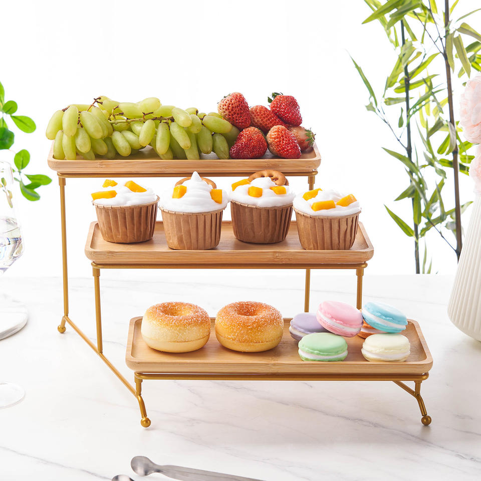 Bandeja de plato de cerámica de tres capas Soporte de exhibición de buffet de hotel para presentación de fruta de pastel de postre