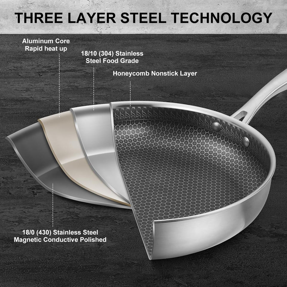 Sartén de acero inoxidable 304/316 de tres capas con tapa Sartén de panal de acero inoxidable de inducción antiadherente Sartén Sartenes