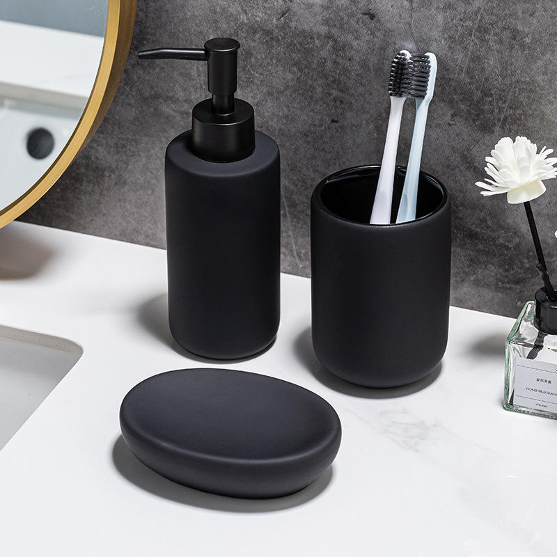 Juego de suministros de baño blanco de tres piezas con botella de plástico Zer, taza para la boca, jabonera, botella de loción para baños