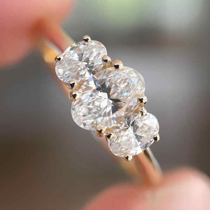 Anillo de diamante CVD de tres piedras Anillo de compromiso de diamante cultivado en laboratorio de corte ovalado 1,50 Ctw Anillo de bodas creado en laboratorio 14K Oro amarillo sólido