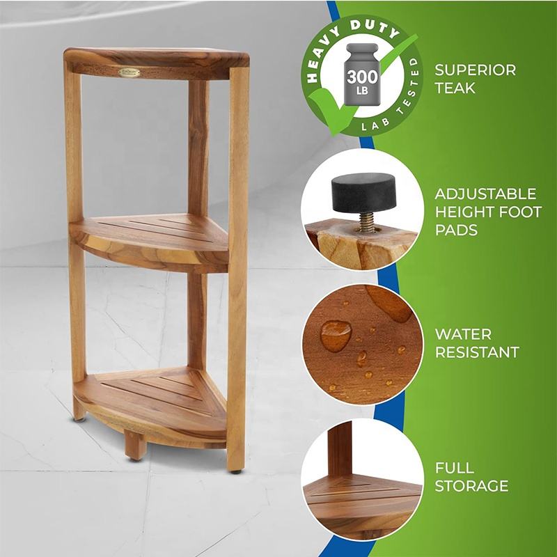 Estante de esquina de tres niveles, Banco de ducha de madera de teca impermeable, taburete, silla de asiento para ducha interior, estante de organización de almacenamiento
