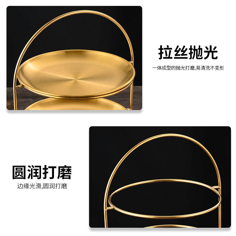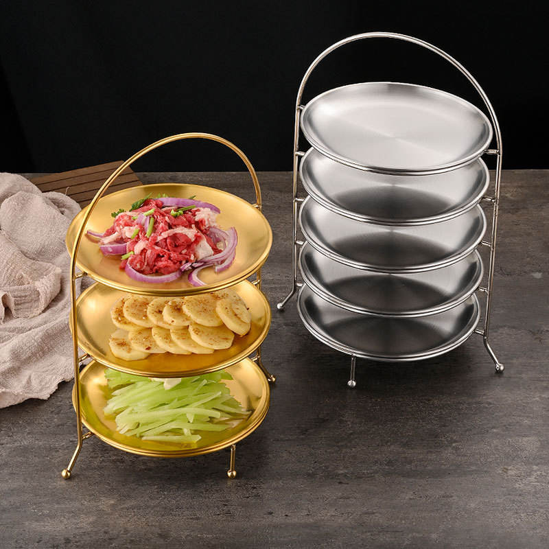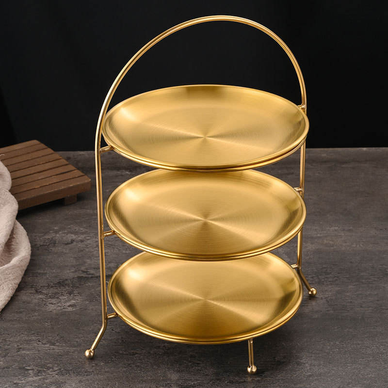 Soporte Redondo de Tres Niveles de Acero Inoxidable con Acabado Dorado para Servir Barbacoa, Hot Pot, Pasteles y Postres