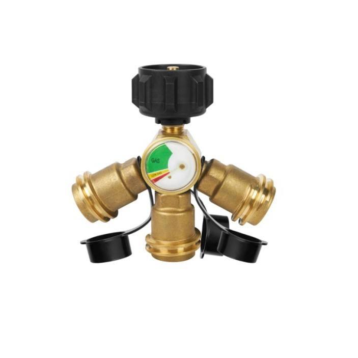 Conector divisor de propano de tres vías con medidor y válvula de cierre para hornos de gas, tamaño de puerto de 3/4 pulgadas
