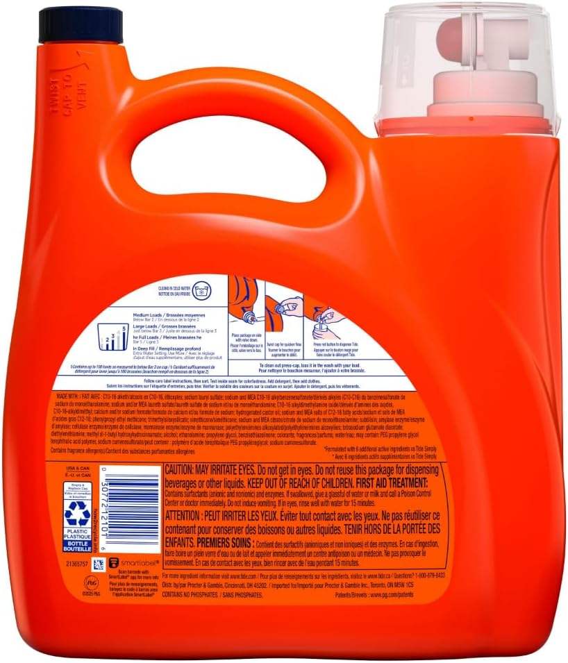 Tide 100 Load Detergente para ropa Líquido 132 oz Fragancia original Fórmula de alta eficiencia para limpieza comercial