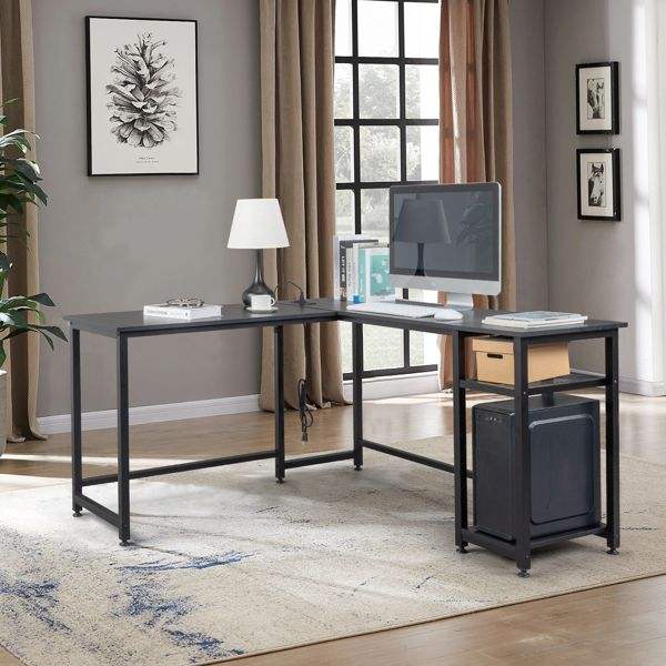 Escritorio para Computadora en Forma de L Tiger Black con Tomas de Corriente y Estante