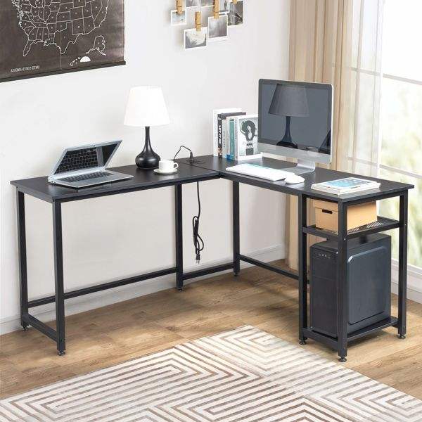 Tiger Black L-Shaped Desktop Computer Desk with Power Outlets and Shelf
