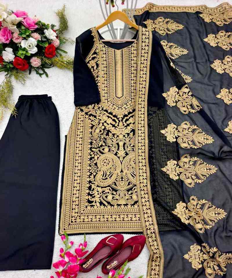 Traje Formal Bollywood Atemporal, Salwar Kameez de Lino con Elegante Trabajo en Piedras y Patrones Geométricos, Top, Dupatta y Pantalón