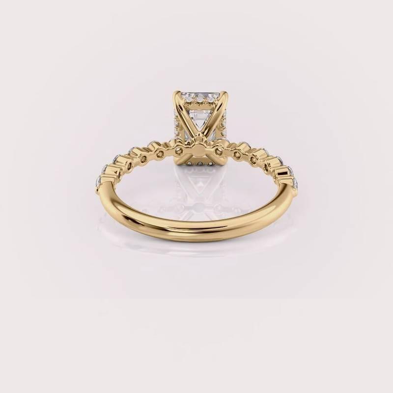 Anillo de diamante de corte esmeralda cultivado en laboratorio atemporal y piedra lateral redonda en oro amarillo de 18 quilates