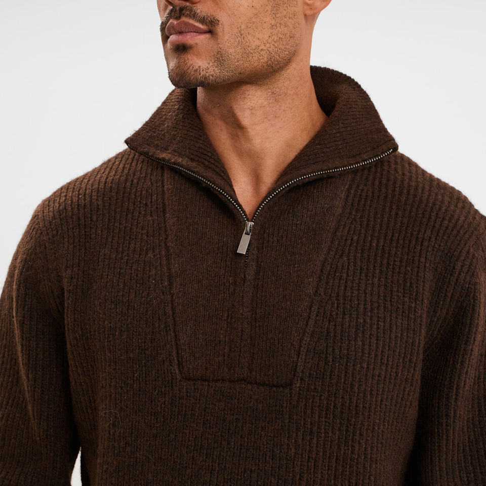 Nombre del Producto:Suéter de Hombre Marrón Oscuro con Cuello Trucker Acanalado