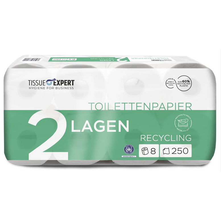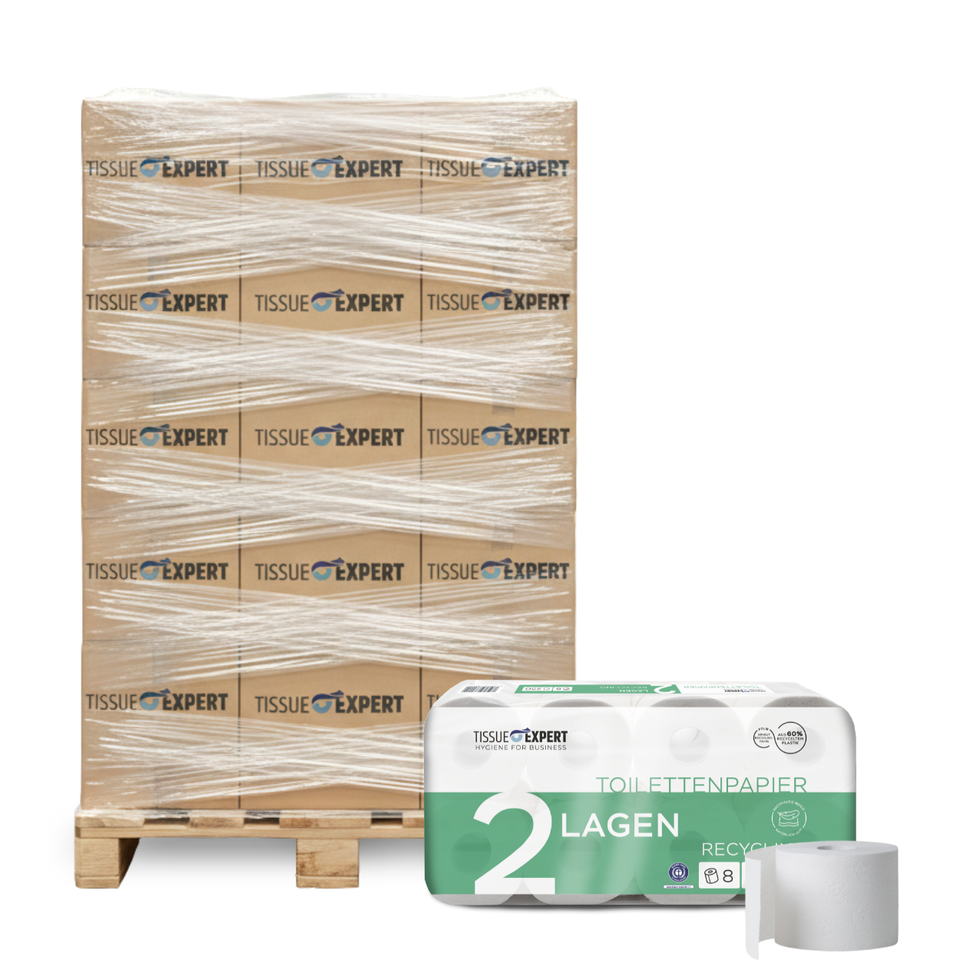 Mercancías en paleta Tissue Expert Papel higiénico reciclado de 2 capas, 250 hojas por rollo, 216 paquetes de 8 rollos