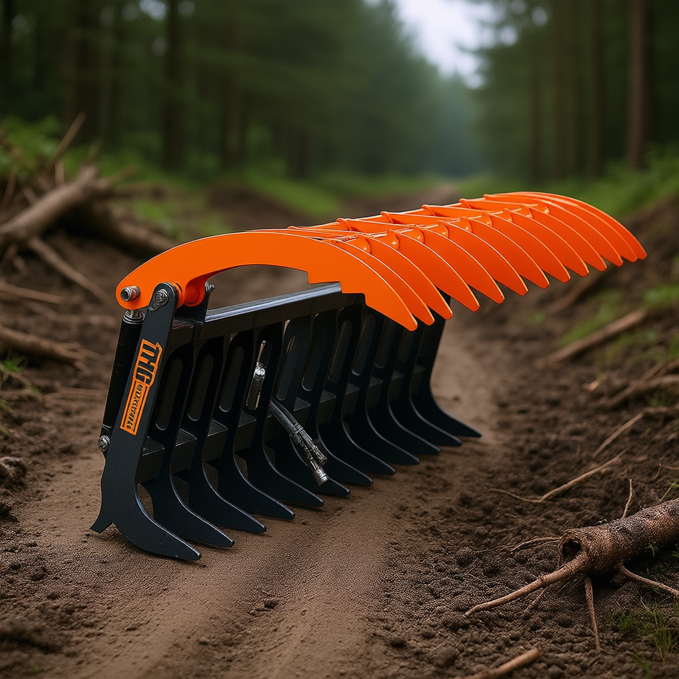 Rastrillo de raíces Tmg Skeleton con espaciado de dientes de 7 pulgadas, cilindros dobles, accesorio para excavadora para minicargadora