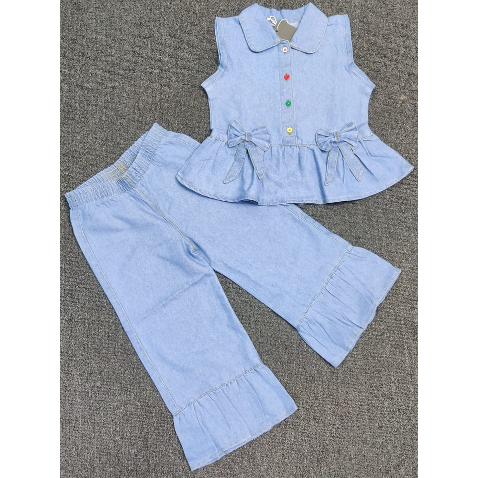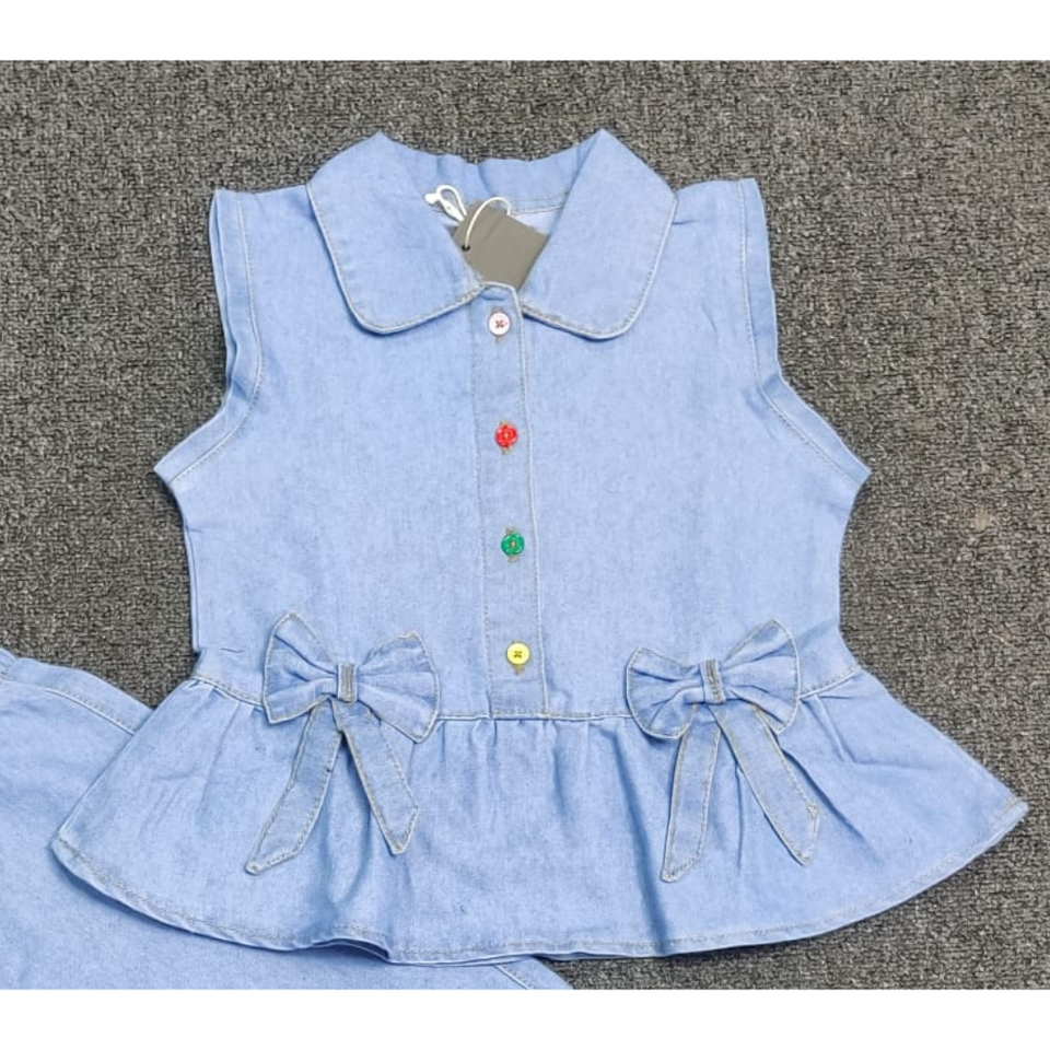 Conjunto de Ropa de Mezclilla para Niñas Pequeñas, Vestido Chambry con Blusa y Pijama, Tela Lavada, Hecho en BD, Tiempo de Entrega de Muestra de 7 Días, En Stock