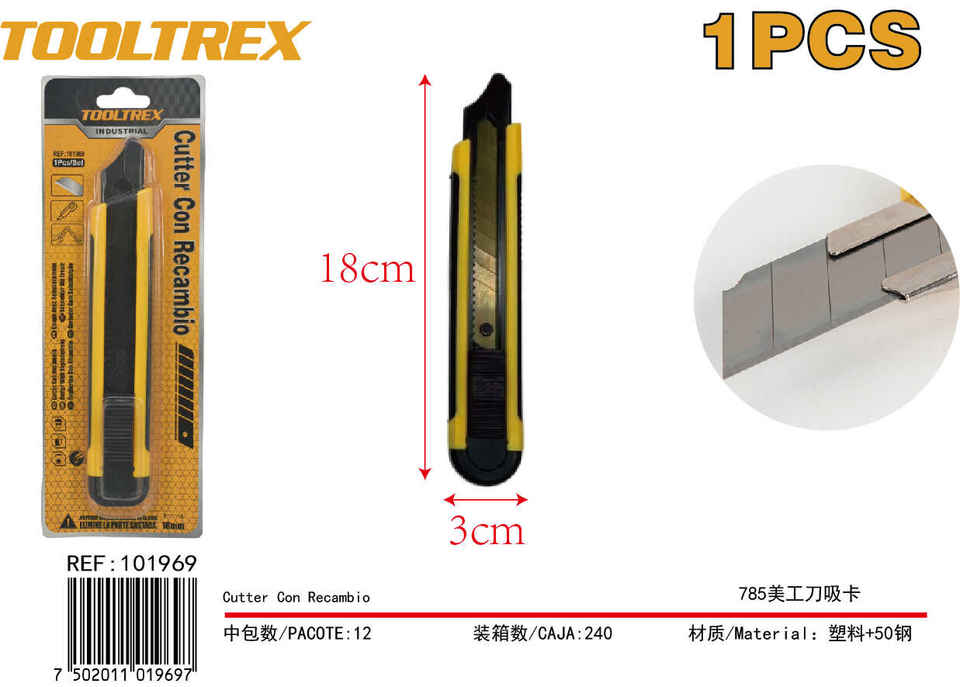 Cuchillo multiusos Tooltrex con cuchilla de repuesto de acero al carbono y mango de plástico