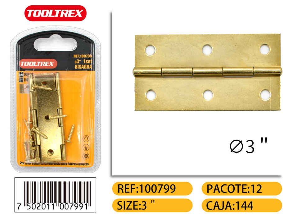 Bisagra Tradicional de Latón de 3 Pulgadas para Puerta, Marca Tooltrex, Apertura de 180 Grados