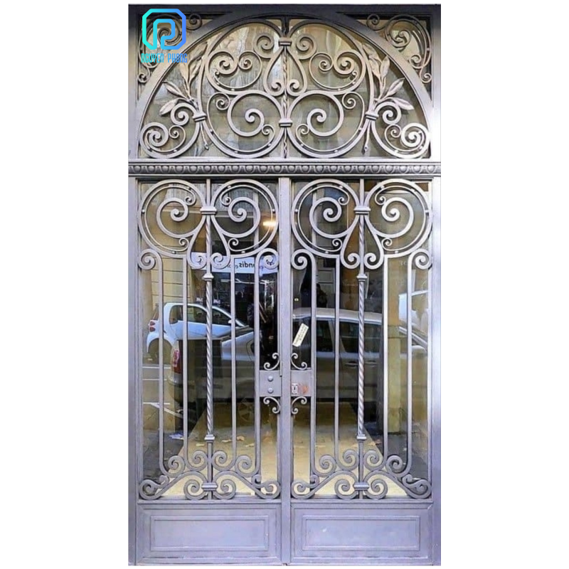 Puerta delantera de lujo de alta gama, puertas francesas de hierro forjado doble, superior de 15