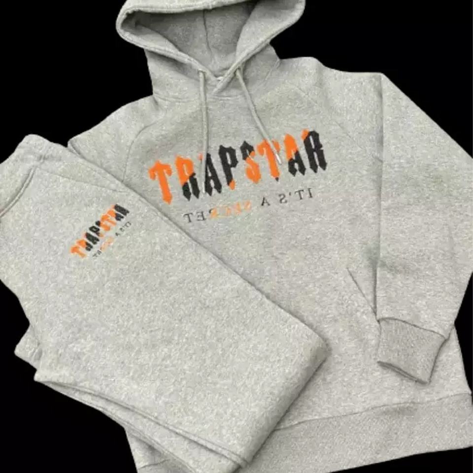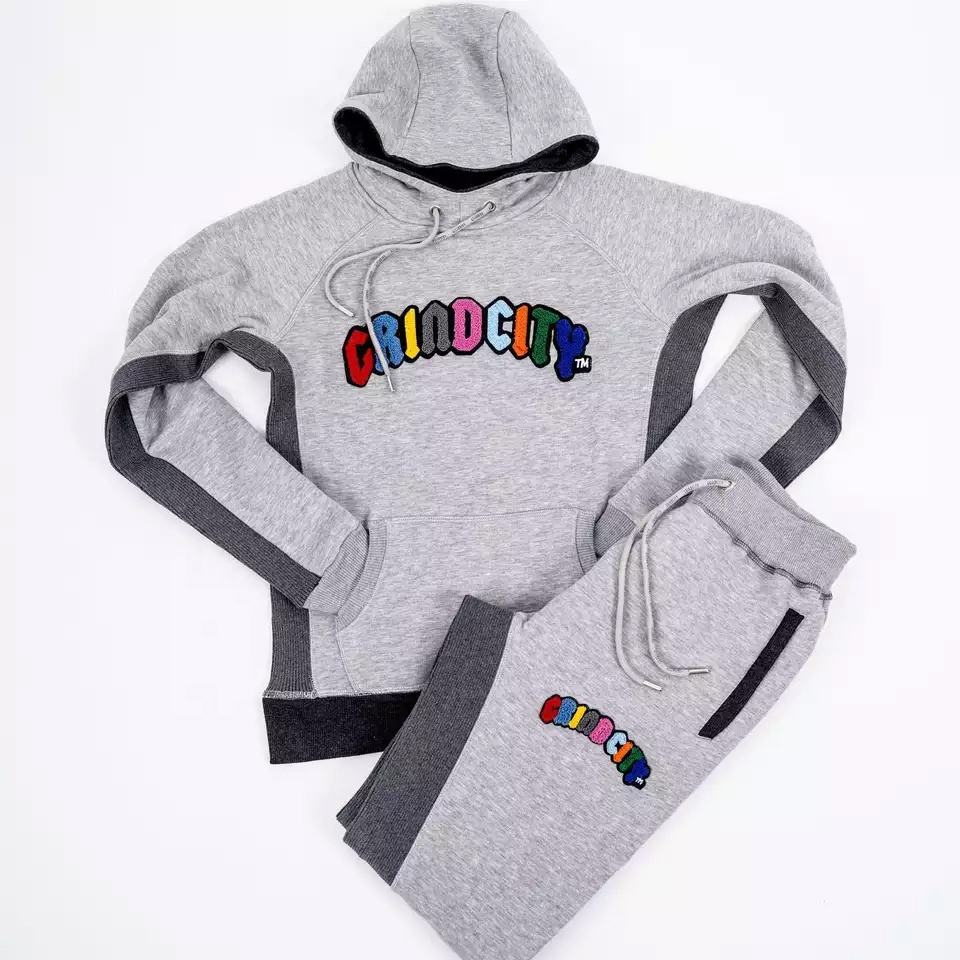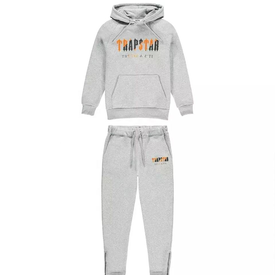 Top exigido personalizado gris y naranja Chenille bordado maternidad ecológico 100% poliéster chándal con capucha conjunto para hombres