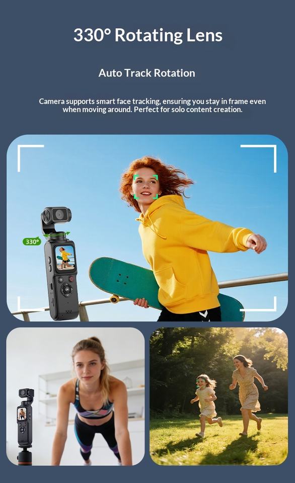 Cámara Corporal 4K con Seguimiento Facial Superior, Micrófono Externo, Mini Cámara de Video y Audio de Bolsillo 330 ° Cámara de Rotación para Viajes en Bicicleta al Aire Libre