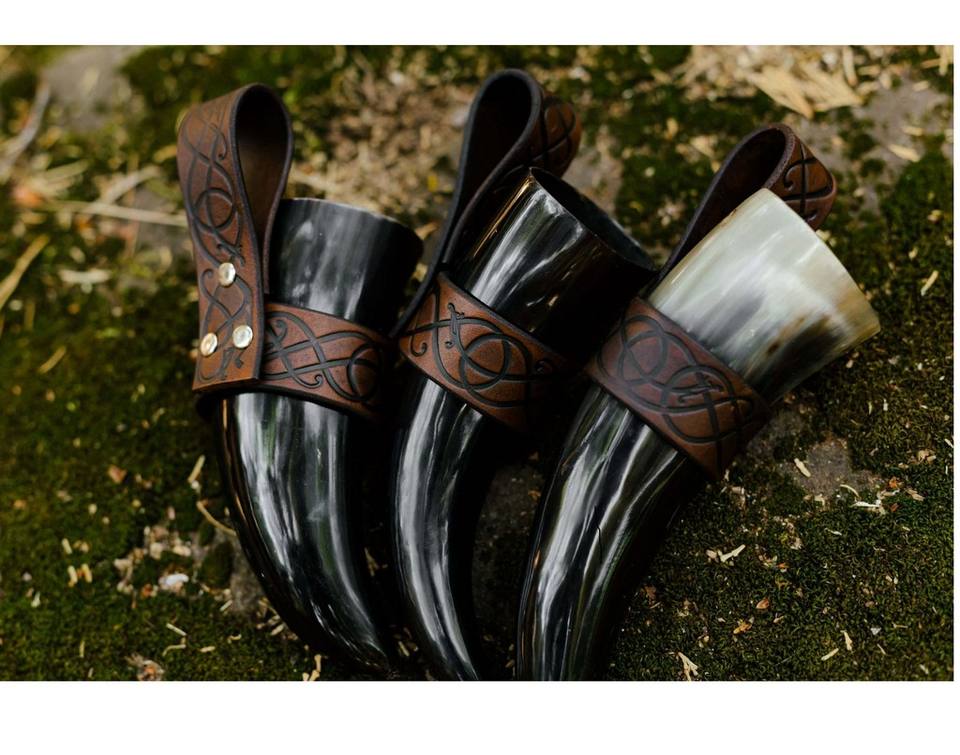 Cuerno para beber hecho a mano natural de último diseño superior con asa de correa de cuero taza vikinga con soporte para cuerno